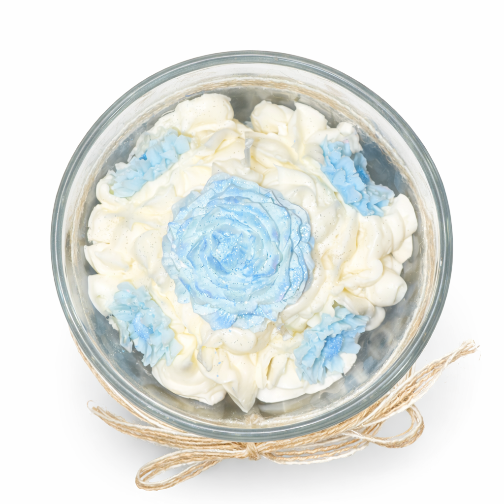 Deze ongeparfumeerde bloemenkaars is een echte eyecatcher. Met de hand gevormde waxbloemen in zachte wit- en blauwtinten geven de kaars een verfijnde, bijna poëtische uitstraling. Elk detail is zorgvuldig aangebracht, waardoor elke kaars uniek is.