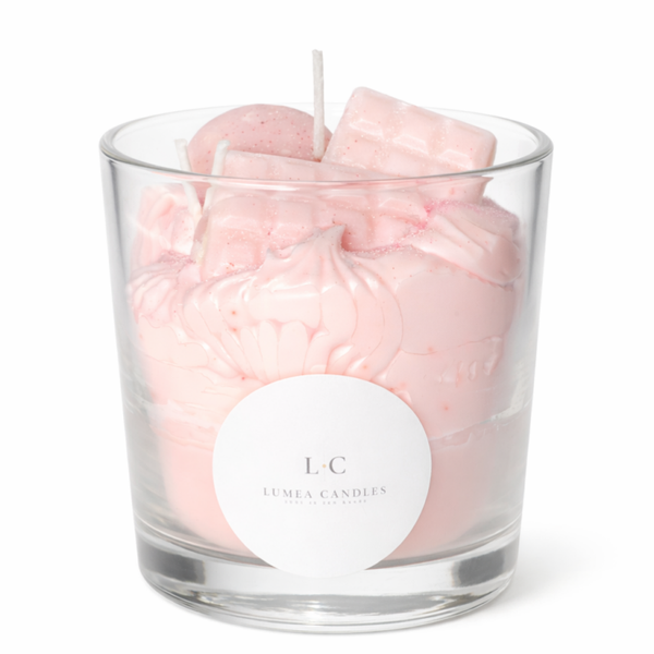 Deze handgemaakte kaars is een echte eyecatcher én een moment van rust in één. De zachte roze tinten en speelse details geven een luxe, romantische uitstraling, terwijl de milde geur “Love” subtiel de ruimte vult zonder te overheersen.